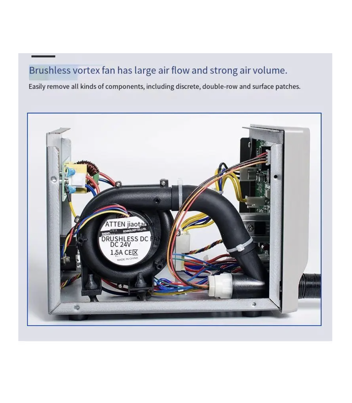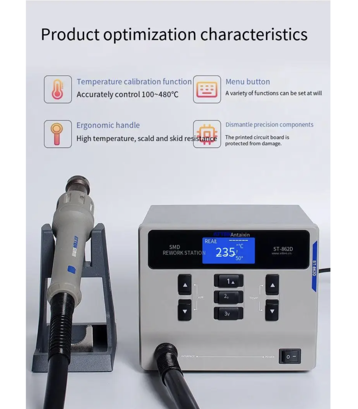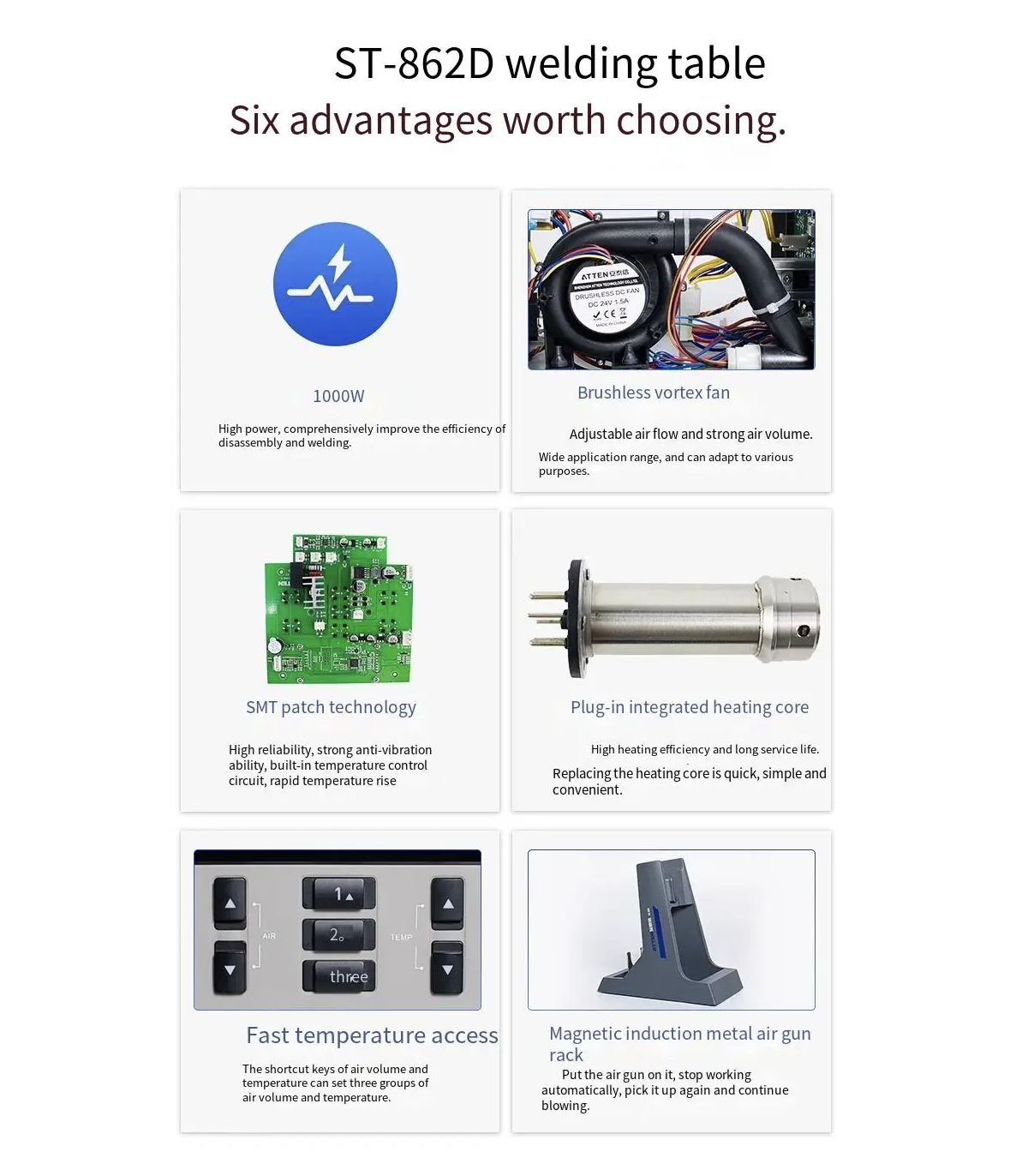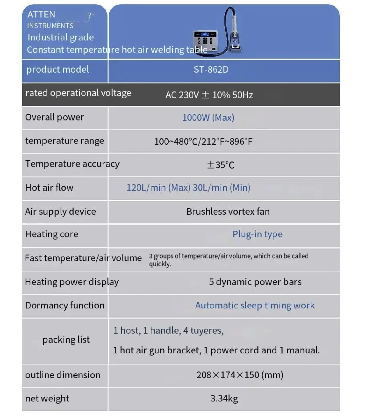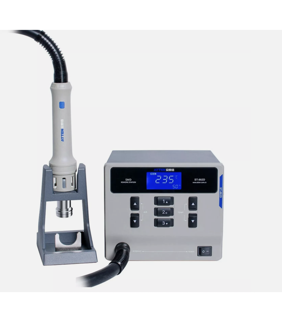 The ATTEN ST-862D Hot Air Rework Station is a professional-grade 1000W tool designed for precise soldering and desoldering of surface-mount devices (smd). It features adjustable temperature and airflow control, making it ideal for electronics repair, PCB rework, and component replacement.
